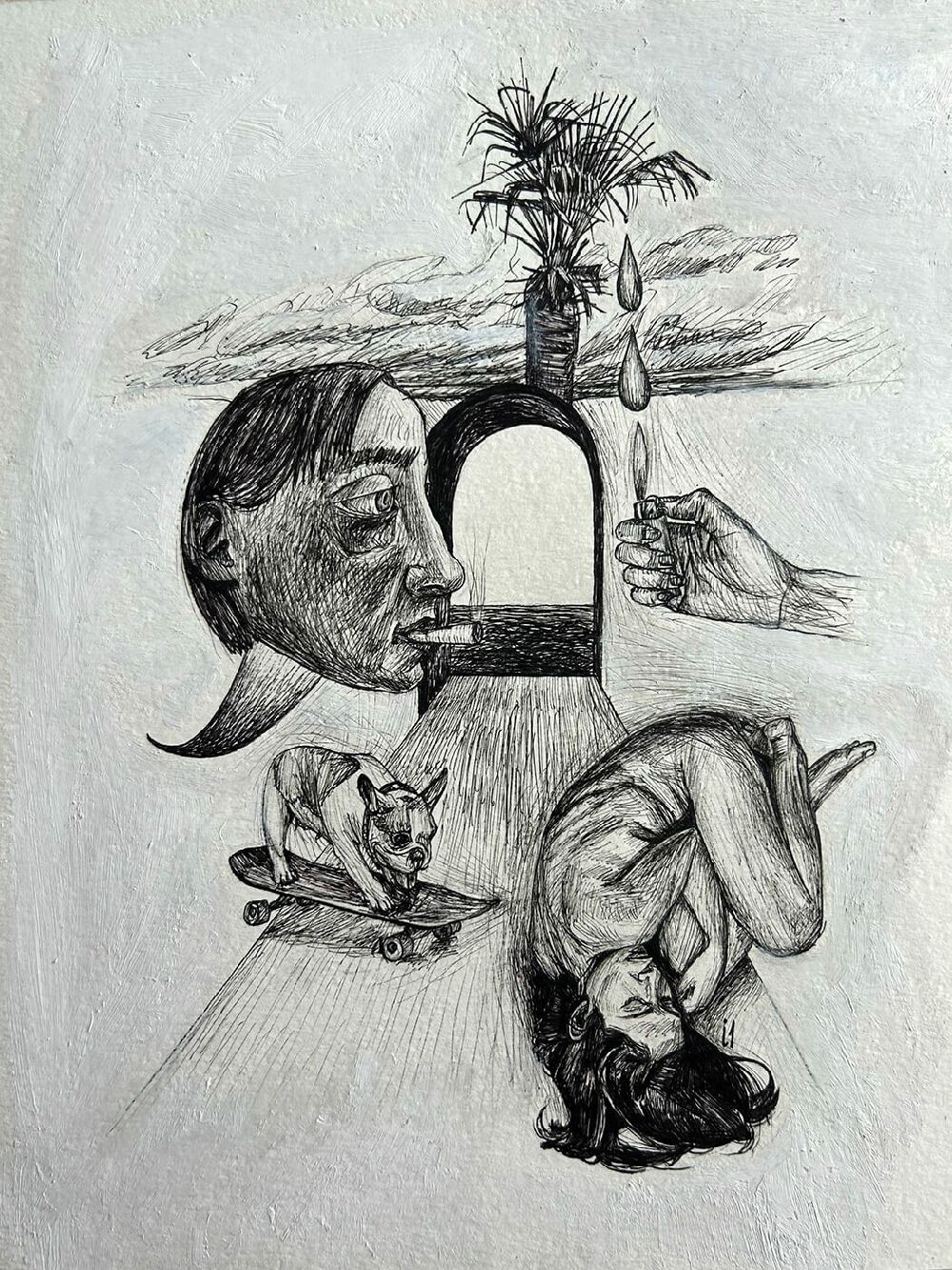 Oil and liner on paper