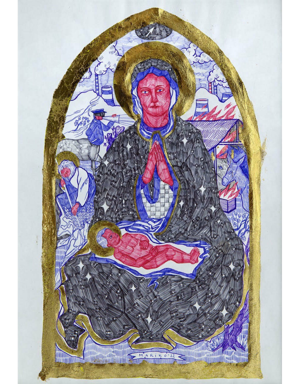 Ballpoint pen and gold leaf sheets on paper