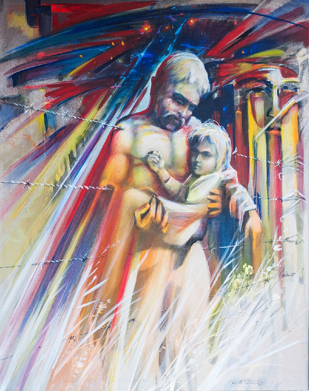 Уже немолодой, обнаженный по пояс мужчина держит на руках маленькую девочку. Это сам художник с дочкой Иванкой на руках. Он и хотел бы идти дальше, но не может сделать и шага, потому что его обескровленное, серое тело пронизывают ряды колючей проволоки. На самом деле это не провода — это Чернобыль пронизывает свою жертву. «Зона проходит сквозь меня, — говорит Петр Емец. — Она ни за что не отпустит».