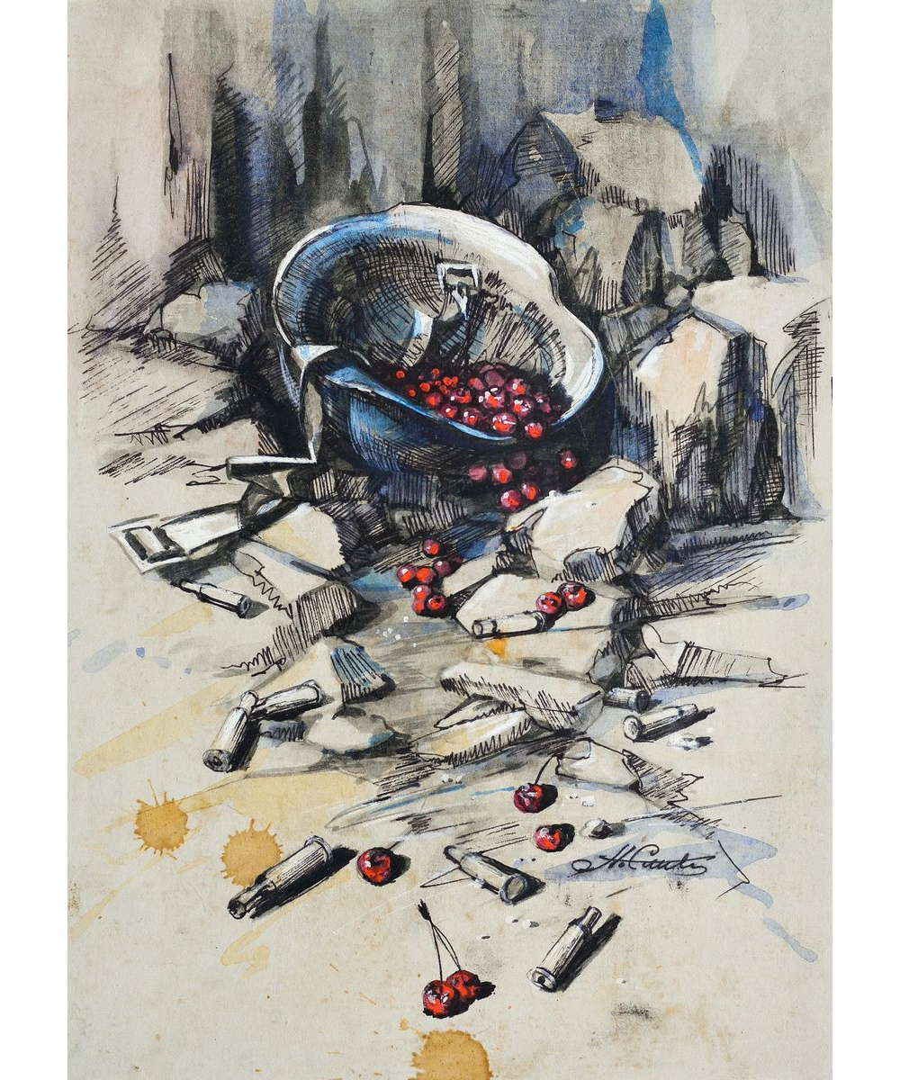 Петр Емец: "Когда спрашиваешь людей, с каким цветом у них ассоциируется война, большинство называет красный и черный. Знак беды и пролитой крови. Но на этом натюрморте красное — не капли крови, а свежая, сочная, блестящая черешня, олицетворяющая саму жизнь, наполненную радостью и яркими красками. И как противовес этому — черная каска на усыпанной осколками разрушенной земле, символ войны и смерти. Однако как бы было хорошо, если бы солдатские каски служили только емкостью для ягод... "