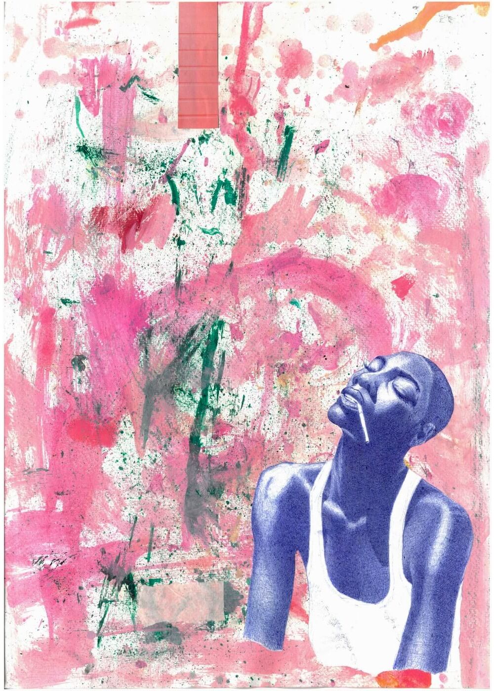 Collage: ballpoint pen, magazine clippings, wrapping paper, oil