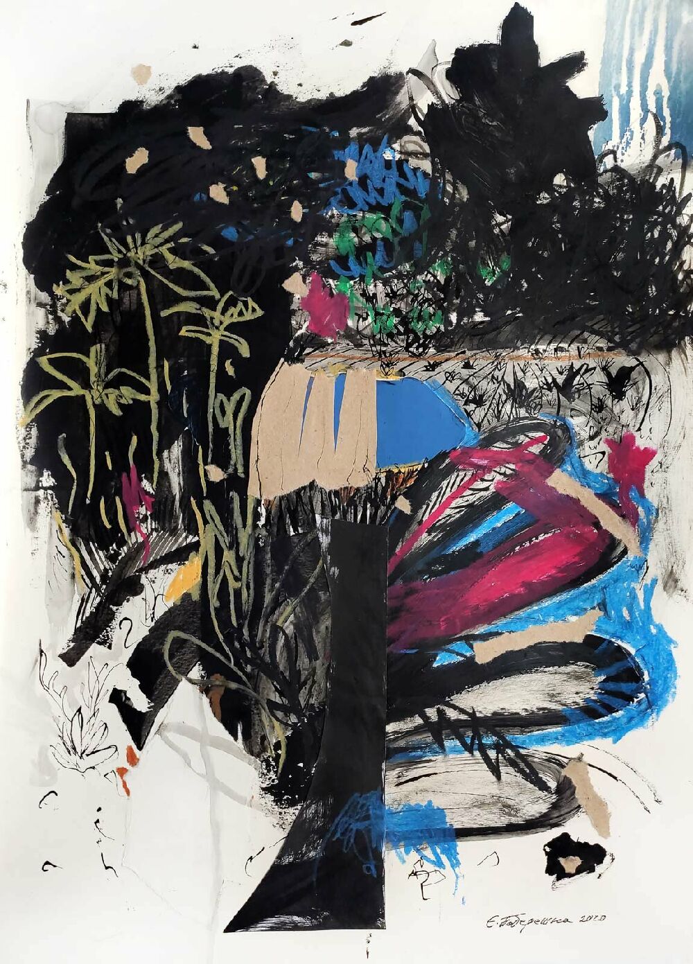Heavyweight old paper, ink, oil pastel, collage