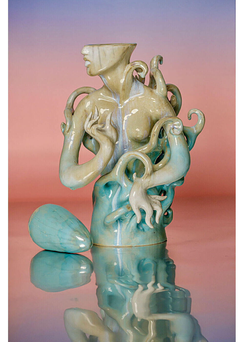 Ручная лепка из шамота и многослойные глазури создают эффект глубины — блеск напоминает поверхность моря, где отражаются свет и время.