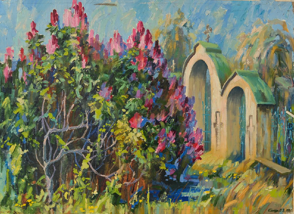 На фоне арки, ведущей к Ильинской церкви, изображен цветущий куст сирени. Художник передает собственное чувство душевной смирения, что парадоксально сочетается с противоположным состоянием восторженного трепета перед святым местом в Чернобыльской зоне.