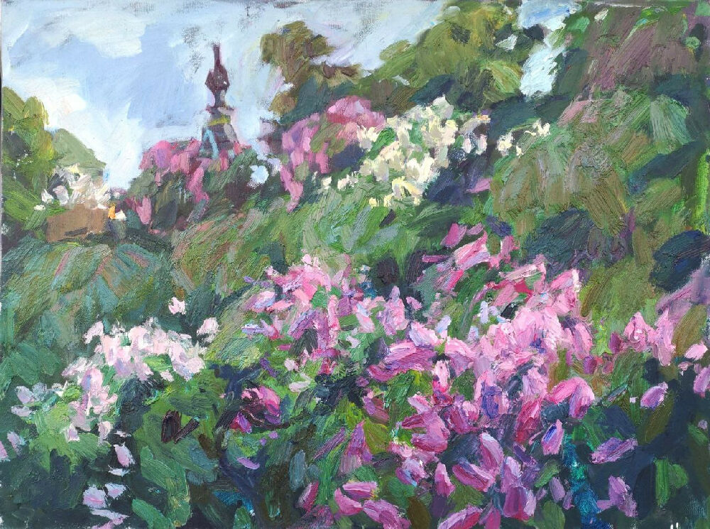 Художники мечтают о пленэре в ботаническом саду сразу после окончания цветения сирени. Это ни с чем не сравнимое ощущение опьяняющего аромата и роскошного цвета, который будто поднимается вокруг сиреневых облаков. Этот пленэр проходил вечером перед дождем. Аромат сирени был еще сильнее. Дождь начался, когда мы еще не закончили работу, и это было очень красиво, когда огромные первые капли тяжело падали на полотна и стекали по красивым дорожкам. Работа очень эмоциональная и живая. Я люблю ее за этот рассказ о написании и эмоциональном содержании.