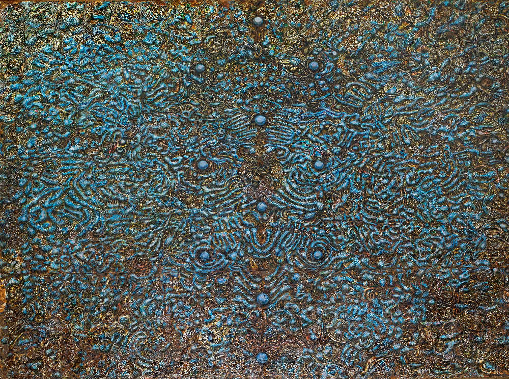 Хаос, кутерьма, броуновское движение. Отдельные фрагменты, частички чего-то несобранного, но обладающего своими собственными характеристиками, интересными чертами характера. И голубые узоры-лабиринты. Они похожи на разветвляющиеся капли животворной влаги. Эта и есть та движущая материя, которая задает мировой порядок. Узоры по краям рассеяны, но ближе к центру он сближаются и приобретают симметрию. Левое отражается в правом. Среди сгустков сплетающихся линий образуются точки. Их десять, по числу сфирот, составляющих Древо Жизни.