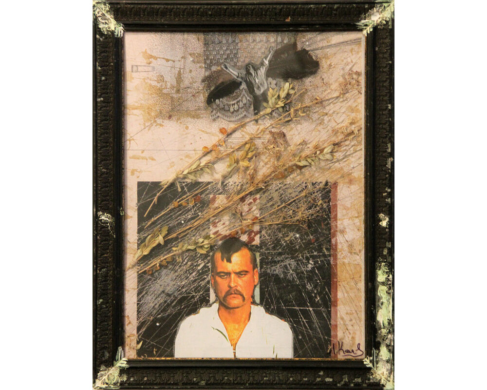 Коллаж, посвящённый Ивану Миколайчуку, которого всегда очень любили как чудесного друга и гения. Янтарь подарен лично Иваном Ларисе Кадочниковой. Рисунок на картоне, удивительно резко и "жестко" изрезанный резаком, найден в мастерской художника Игоря Горяного . В защитное стекло вживлены искорки - звёздочки из кристалликов Сваровски