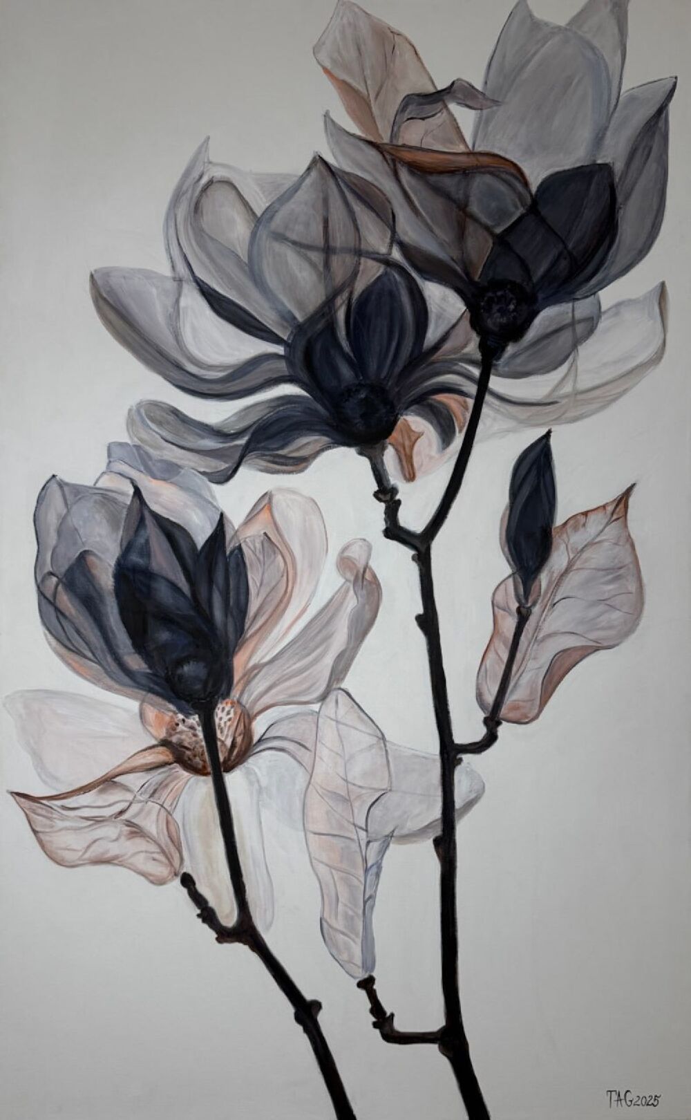 Сучасна картина із зображенням делікатних квітів магнолії. Виконана в м'яких кольорах, ця робота створює спокійну атмосферу. Квіти здаються невагомими та перебувають у процесі цвітіння.