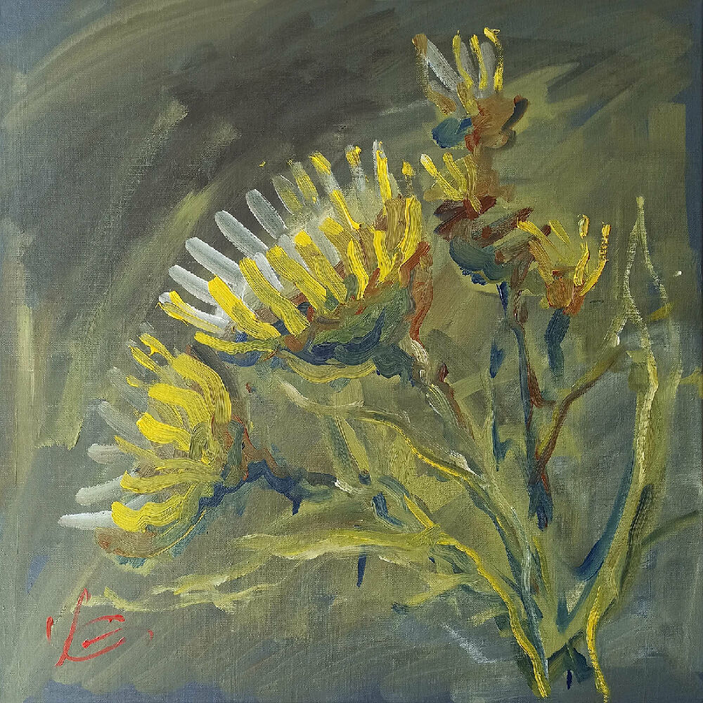Кожен художник рано чи пізно звертається до теми натюрморту із соняшниками. Ця унікальна космічна квітка завжди викликає емоції. Два кольори: жовтий та зелений, є визначальними у роботі. Жовтий, як символ сонця та зелений, як символ життя.