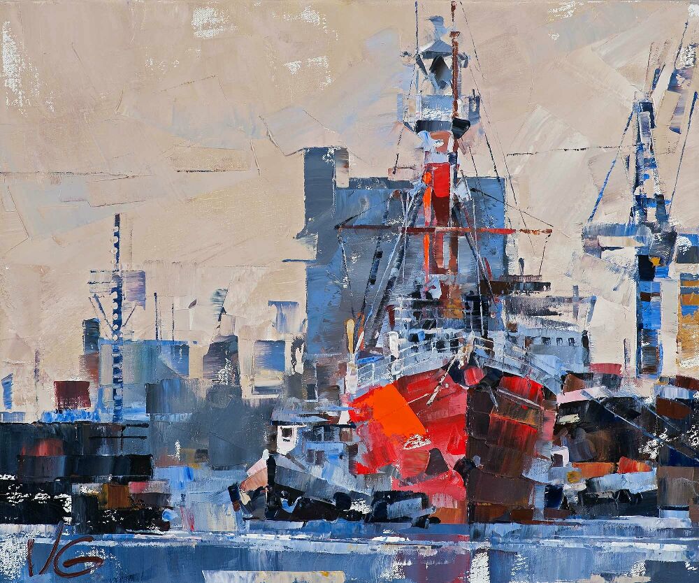 У картині я хотів передати стан міста, що пробуджується: перші індустріальні звуки, що розчиняються в ранковому серпанку верфей, скрип підкранових балок, шурхіт транспорту на пристані. А головне - це контраст холодних нічних тонів, що поступаються місцем теплим ранковим кольорам нового дня та домінуючому червоному кольору свіжофарбованого корпусу маяка Амрумбанк. Імпозантна хода до місця його стоянки в центрі міста, очікування містян і гордість кожного, хто бере участь в активному житті легендарного корабля – це емоції, які не забуваються.