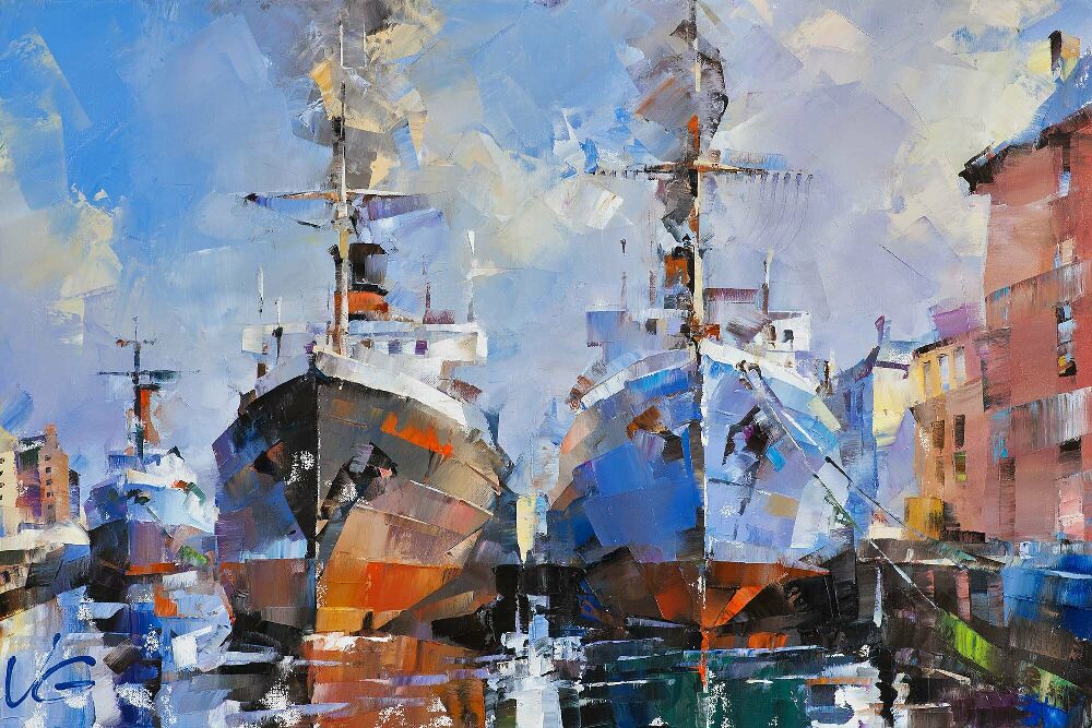 Два величні кораблі стоять на якорі на тихому рейді, з їх труб піднімається пара, яка плавно зливається зі свіжим зимовим повітрям. Атмосфера сповнена відчуттям спокою та очікування, оскільки міські будівлі вишикувалися на горизонті, їхні силуети пом'якшуються ранковим світлом. Фрагменти крижин ліниво дрейфують по воді, додаючи неземної краси видовищу. Поверхня води відбиває важкі корпуси кораблів, створюючи заворожливу гру світла і відбитків. Ця картина запрошує глядача поринути у безтурботну атмосферу приморського міста морозним ранком.