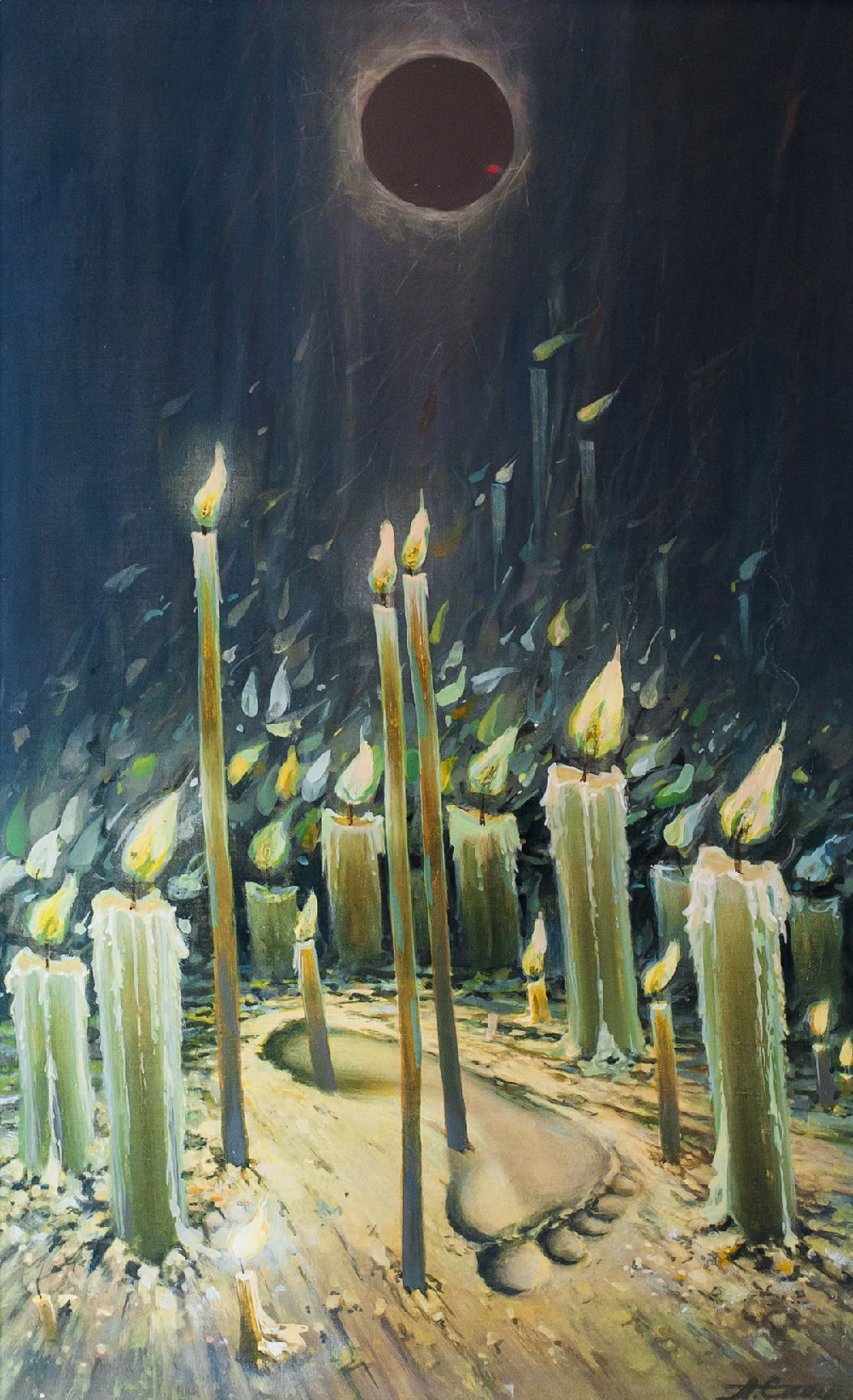 Целое поле заженных свечей. Хотя нет, это не поле, а город ... Свечи разные по размеру, высокие и пониже, как заброшенные дома в Припяти. Зеркало неугасаемой памяти, которую художник зажигает в память о безвинно убиенных ... На бесплодной земле — след от ступни человека. Вот и все, что он оставил.