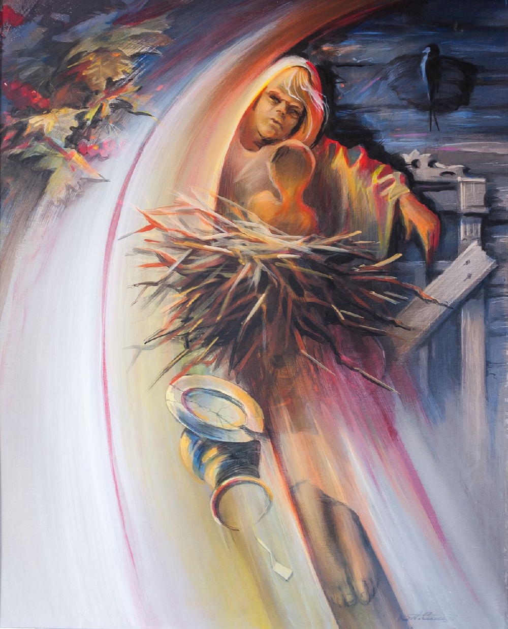 Разрушительный немилосердный поток сносит уютный мир обжитого семейного бытия. Последнее, что удерживает молодая женщина, — плетеное гнездышко со своим ребенком.