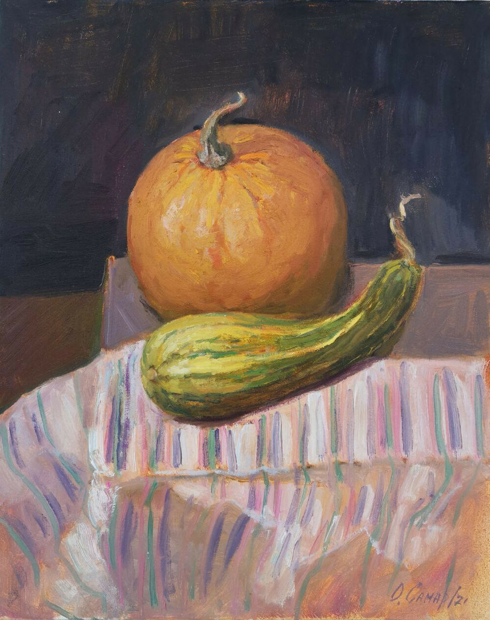 Гарбузи дуже барвисті. На одному із симпозіумів українського мистецтва іноземні художники були вражені фарбами українських гарбузів. Ось ці два родича і надихнули мене на невеликий барвистий натюрморт. Ритм ліній та золотисті кольори додають гарного настрою.