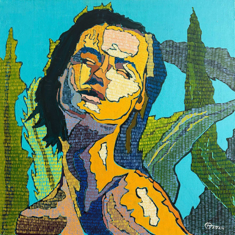 Кольорова палітра, побудована на яскравих синіх і жовтих тонах, символізує чистоту думок і теплоту віри. Легкі, майже ефірні контури фігури гармонійно взаємодіють із навколишнім простором, створюючи відчуття природності та єдності з природою. Зелені акценти додають композиції життя та енергії, а текстурні мазки, що нагадують мозаїку, додають динамічності та багатогранності образу.