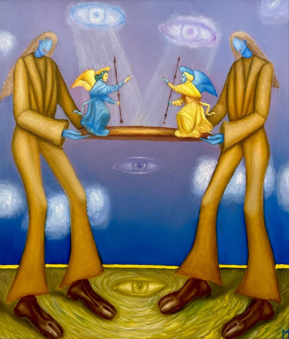 Це схоже на ринг, де виставленні на бій два янголи. Символічно вони синьо-жовті, тому що важливу роль грає цілісний народ та безпека кожного українця яку зараз ніхто не може гарантувати.