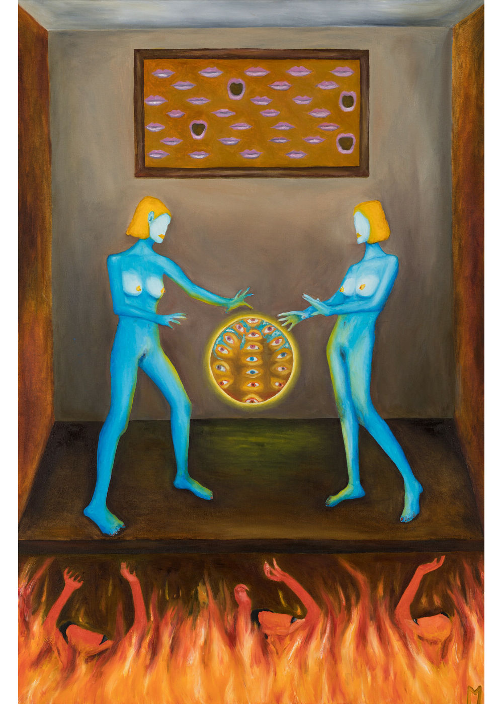 На картині у кімнаті стоять дві дівчини, які в такий темний час абстрагуються від війни та негативу, який лізе скрізь. Вони наче в медитації виробляють позитивну енергію, не зважаючи ні на що.